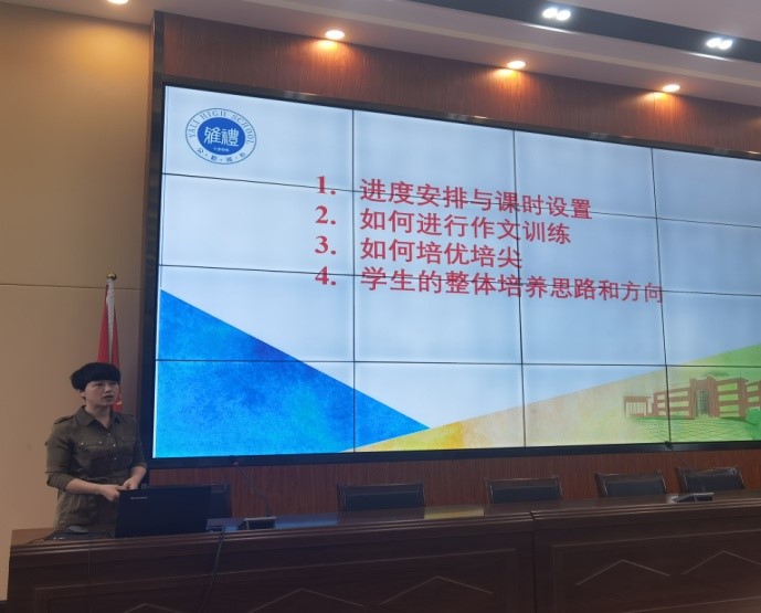 本次教研活动特邀请雅礼中学来我校支教的王粲老参加,王老师首先介绍了雅礼中学英语组教研活动的开展情况,然后她还就“进度安排与课时设置”,“如何进行作文训练”,“如何培优培尖”,“学生综合素质的整体培养思路和方向”四个话题详细地介绍了雅礼中学具体思路和实施方案。